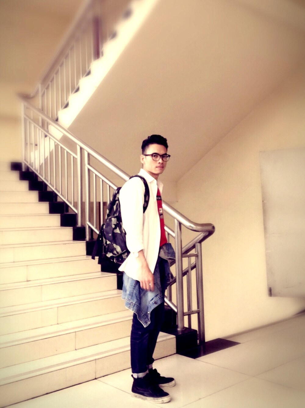 当时的天气,早晚温差比较大的造型。衬衫是长款类型的,穿上牛仔衣外套时也可以很有层次。
