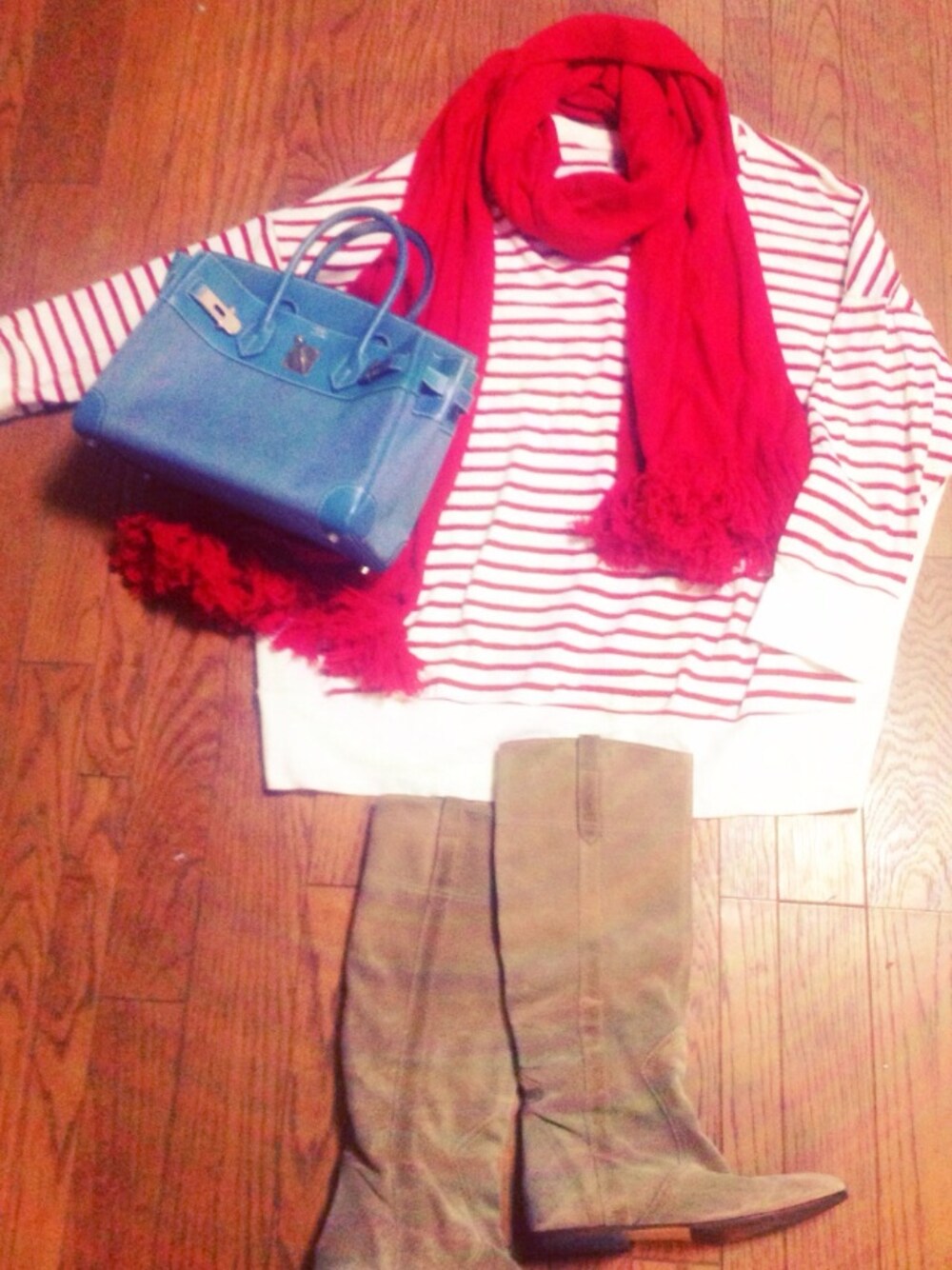 ボーダーのゆったりワンピ:cher 赤のカシミアストール:cher ブーツ:ファビオルスコーニ バッグ:エルメス cherとエルベシャプリエを見に代官山へヾ(≧∪≦*)ノ〃