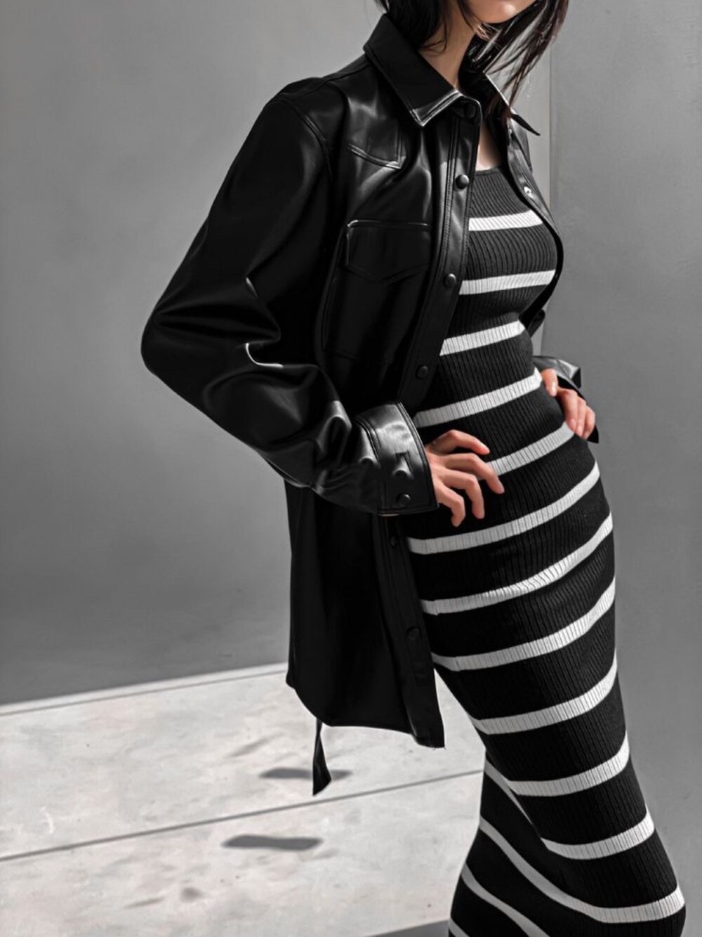 今着れるボーダーのワンピースに、 秋使用のレザーシャツ😘