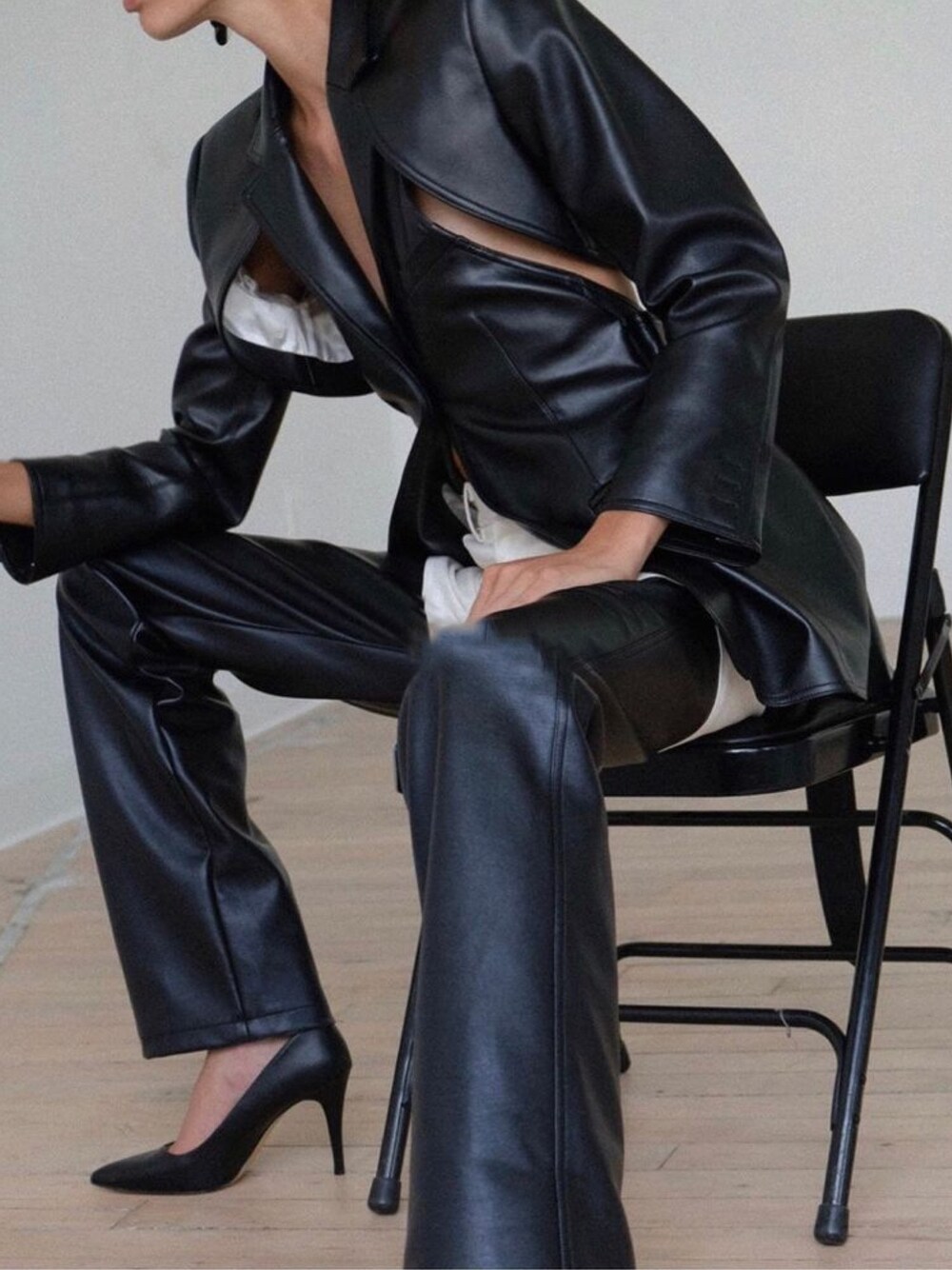 レザーオンレザーのコーデ。 重くならないよう、 カッティングデザインの レザーシャツに。