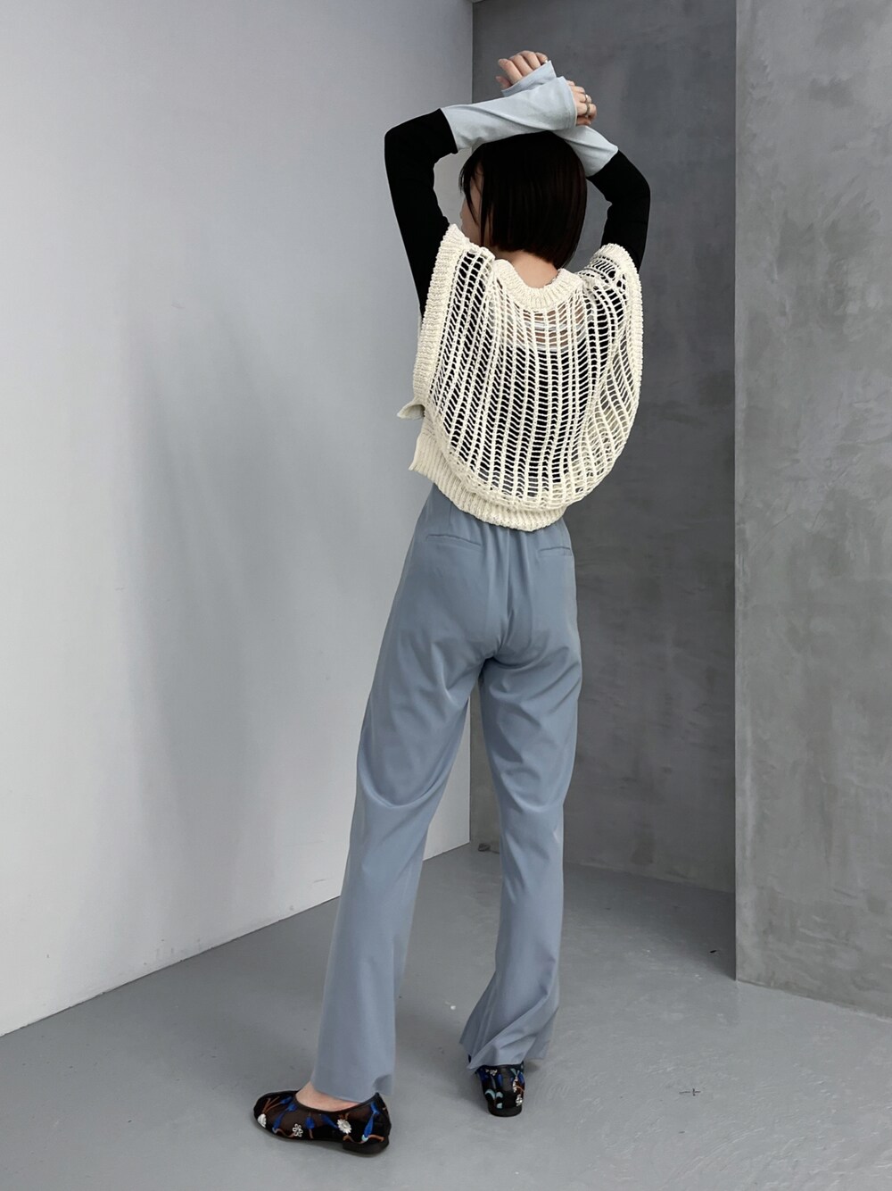 淡い水色のトーン合わせ シンプルなコーデにベストトップスで ニュアンスを足してみるのも○
