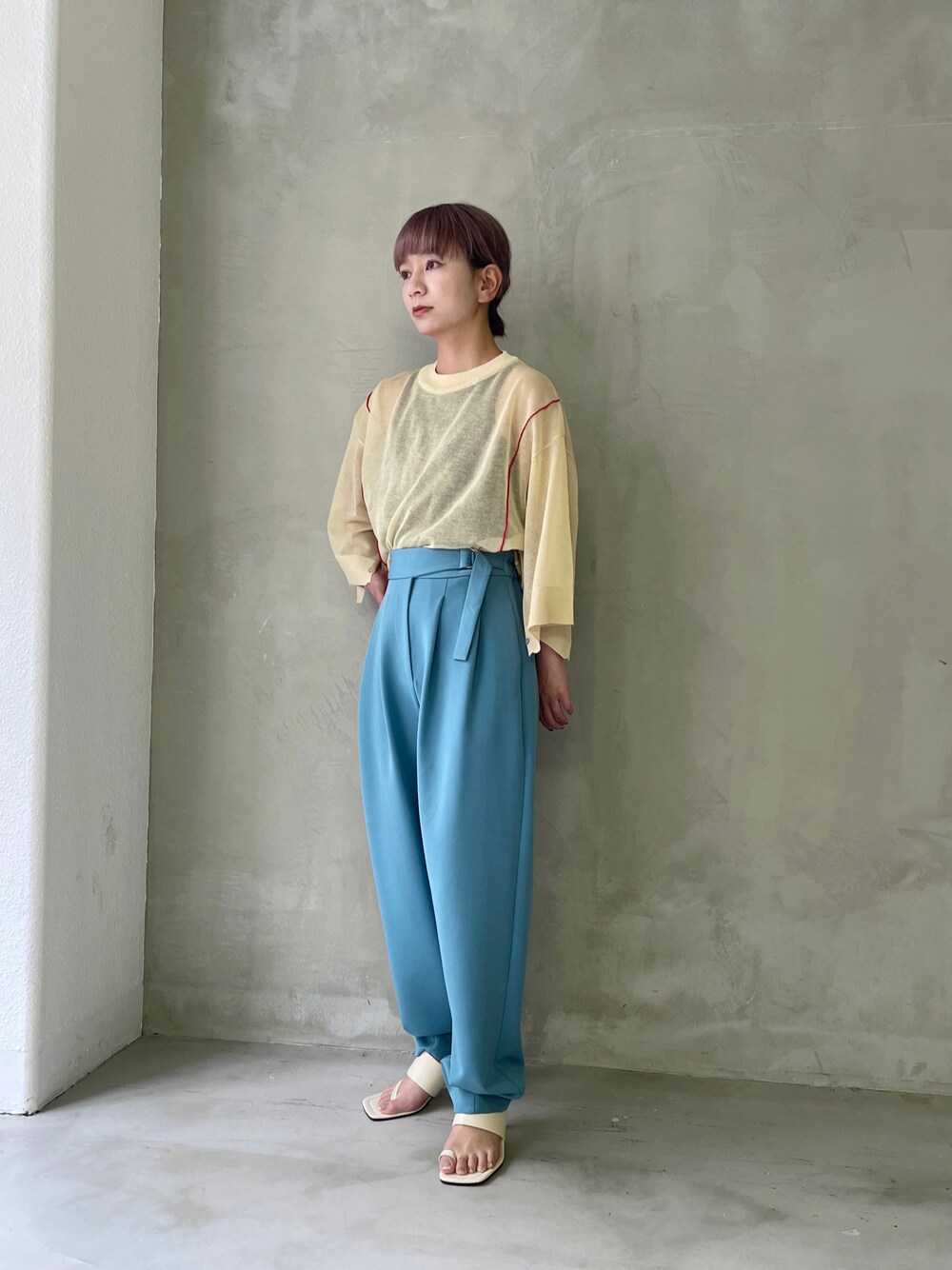先週発売されたシアーラインニットの半袖ver。 人気色のベージュはカラーパンツと 合わせるのもおすすめです!