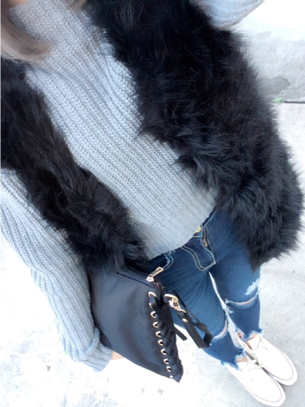 ブラックのファーベストにEVRISのお気に入りのスキニー❤️裾がフリンジでめっちゃ可愛いよ〜〜!
