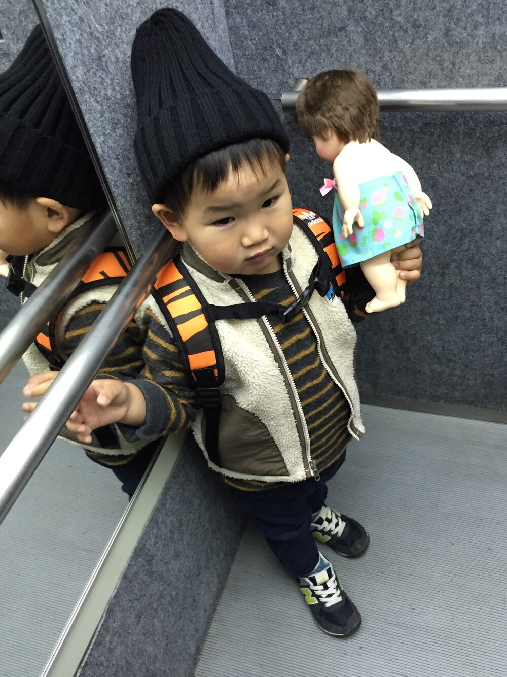 急にリュックを持ちたいと言い出し 1歳の時に買って 一度きりだったアディダスのトラさんリュック 今日は背負ってお出かけしてくれました ぽぽちゃんも一緒に