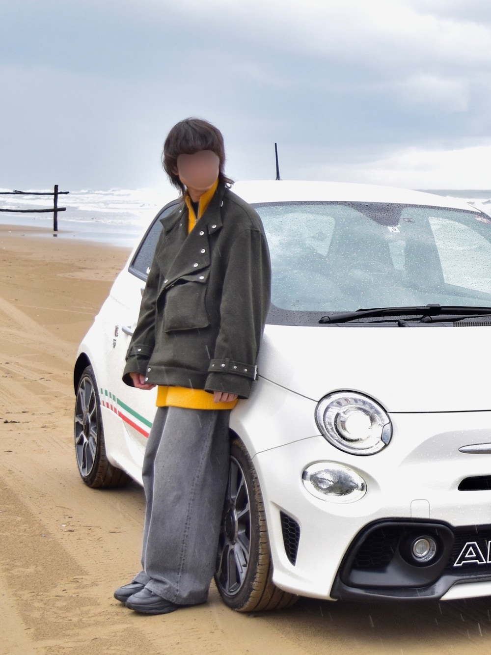 愛車とツーショットです🇮🇹MAISON SPECIALのカーキ色モーターサイクルJKTと黄色ドライバーズKnitの相性が抜群です!パンツはLui'sのワイドデニムにしました。デニムながらモード感があり、ウール素材アウターとの相性が非常に良いです! このモーターサイクルJKTはかなり機能性が高いですが、ものすごく深い色合いと表情を持っていて最高に気に入っています!