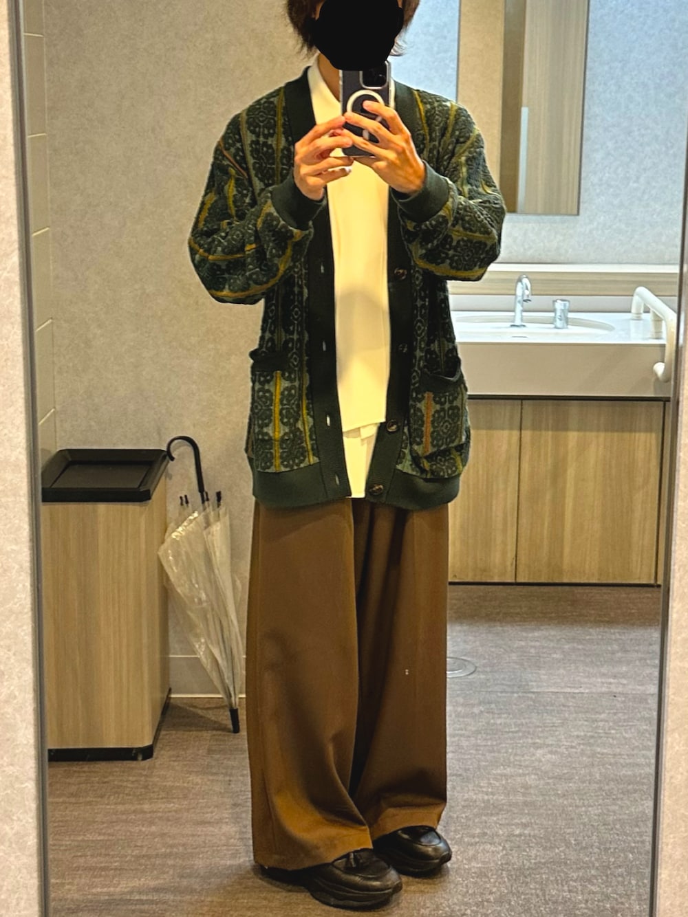 緑のレースカーディガンに青みがかった茶色のウールスラックスを合わせてみました。白で爽やか要素足してます。CULLNIのボウタイシャツがすごく可愛くて気に入っています。ボウタイだけでなく、ジャケットのサイドベントのようなサイドスリット、背中の細い4本のタック、金ボタンが最高です。本革ながら防水のスニーカーで雨対策もバッチリ。