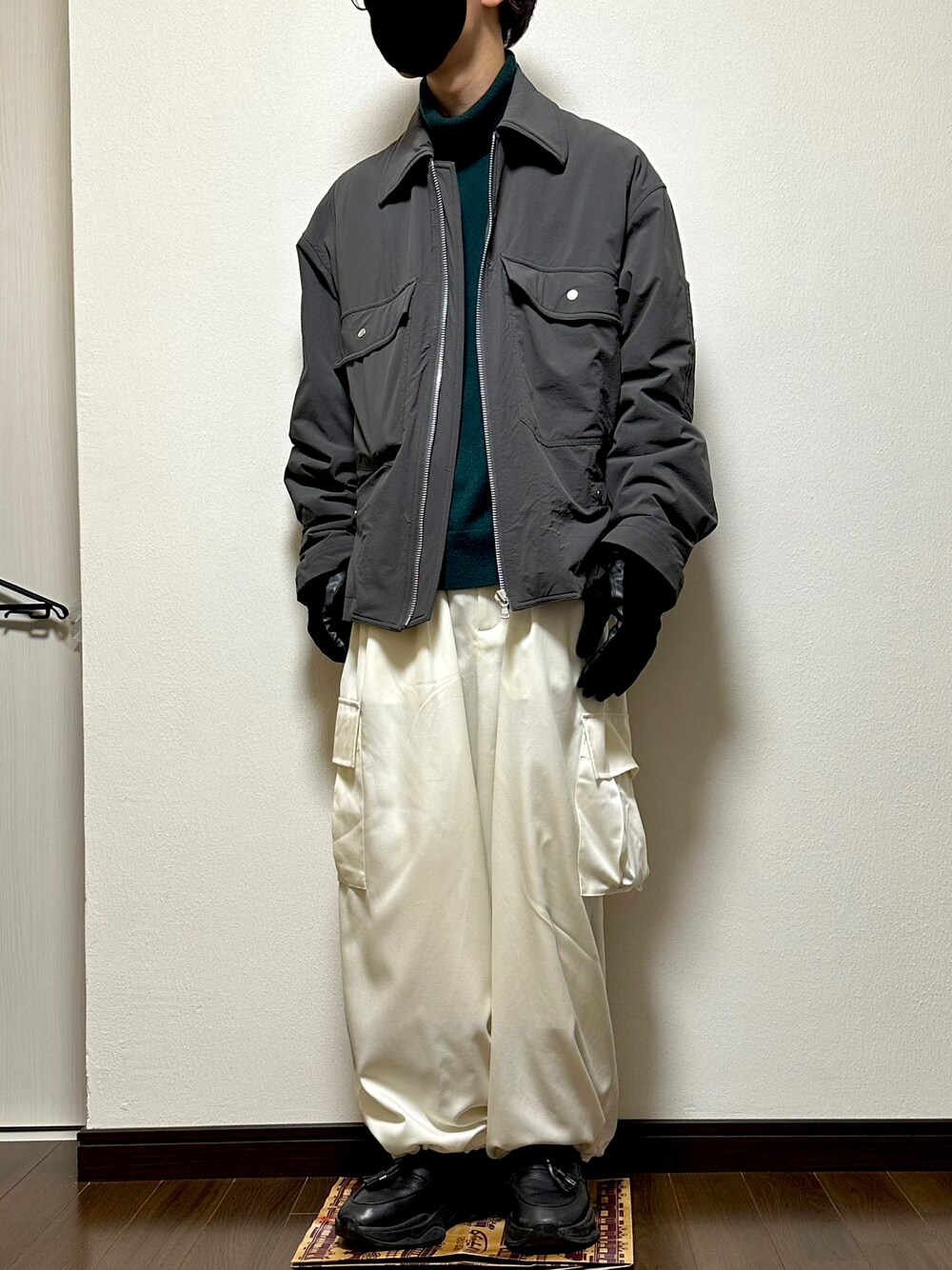 ナイロンのフライトジャケットにカーゴパンツでミリタリー要素、ラフな雰囲気を出してみました。タートルネックニットや革スニーカーでキレイめな要素を足して。