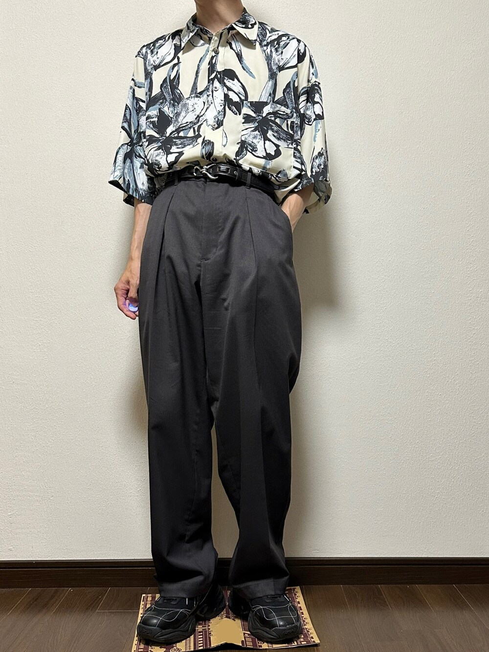 夏は1枚で決まる柄シャツ!MAISON SPECIALの柄はどれもデザイン性が良いです!キレイめなウールmixのスラックスでカジュアルすぎないコーデに仕上げました。OAOのスニーカーはキレイめにもカジュアルにも万能!