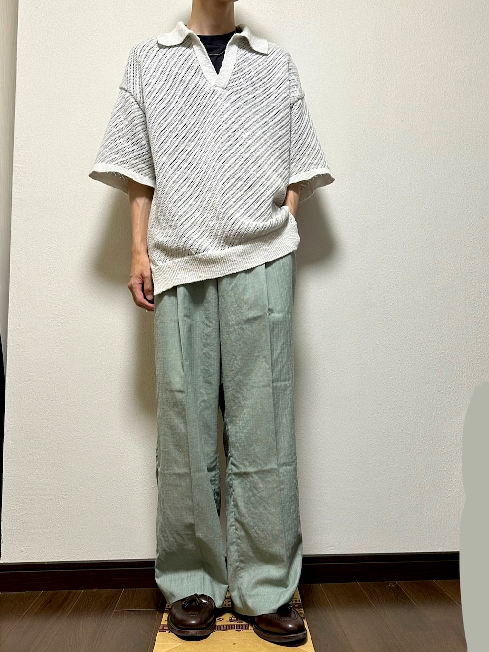 Maison Specialのメッシュポロシャツは夏らしい涼しげな雰囲気。青系や緑系のパンツと合わせるのが好きです!でも何色でも合いそうな感じがします。 首元はネックレスを出して華やかに。足元はDark Brownのローファーで程よくキレイめに。