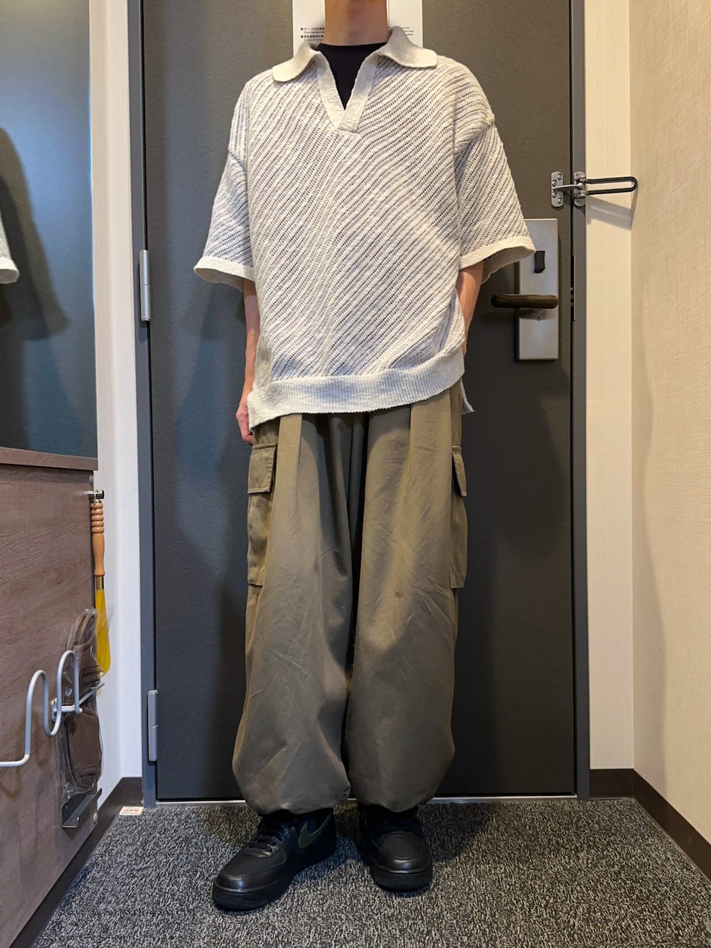 メッシュポロシャツはトレンド感があるだけでなく、すごくバランスの取れたアイテムでどんなパンツでも合います! カーゴパンツはかなり太めです。高級綿のフィンクスコットンを使っており、自然な光沢感がすごく良いです。 細かいところですが、エアフォース1のNIKEマークがカーキで統一感があります。人には伝わりませんが😇