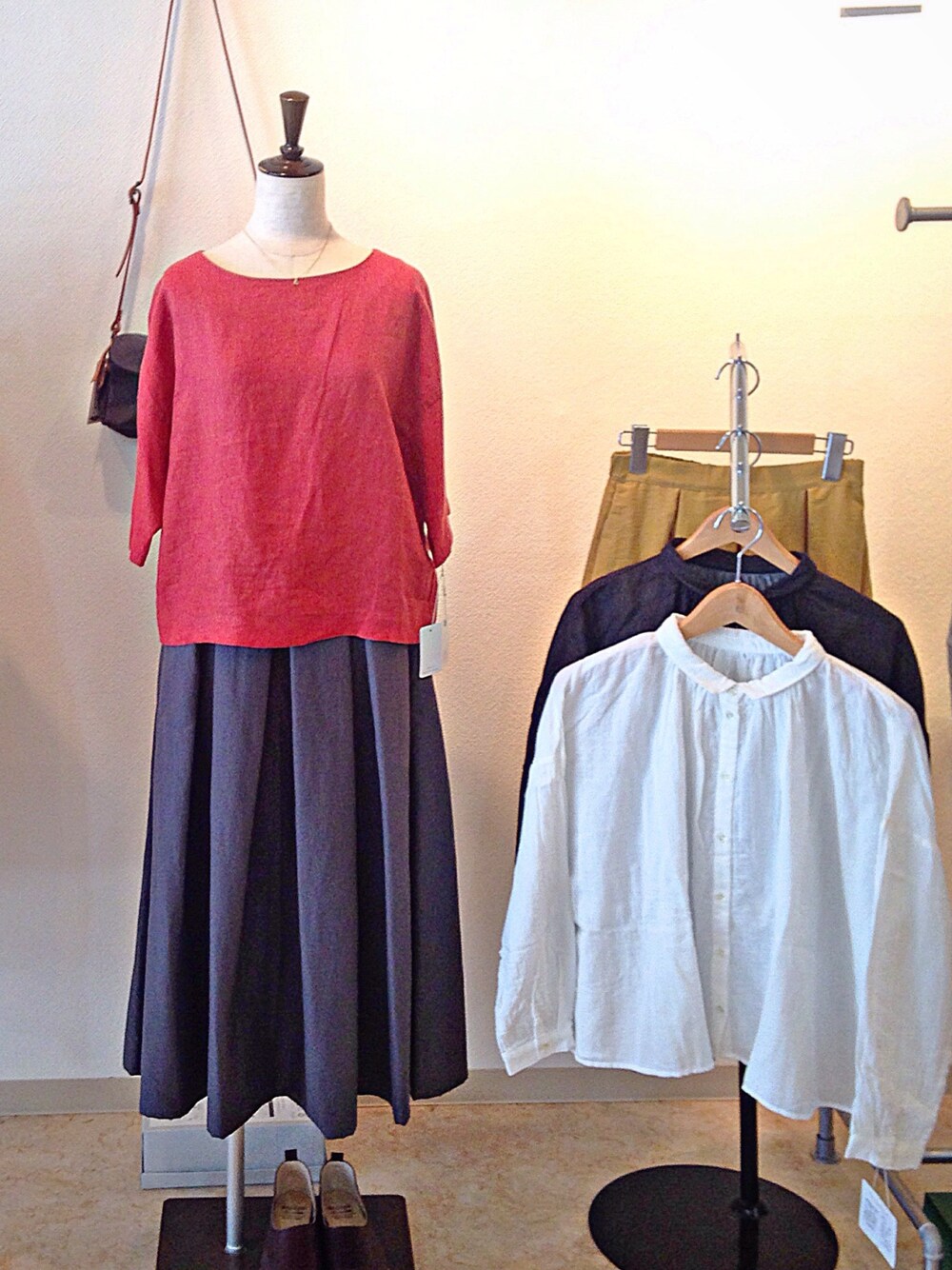 ina 初秋のコーディネート。 しなやかなリネン素材のプルオーバーを、幅が広めのタックスカートと合わせて。 シンプルな組み合わせですが、コックリとしたカラーで季節感を感じさせています。