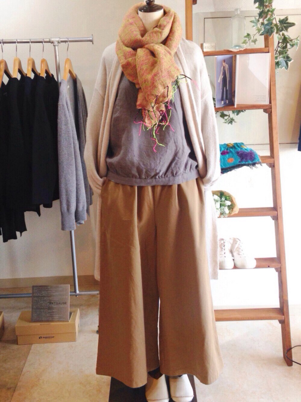 ベージュ系の柔らかな配色で暖かな雰囲気のコーディネート。