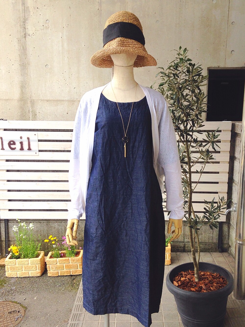 和歌山で織られた、味わい深いオリジナル生地で作られたシンプルなワンピースに、光沢感のあるリネンのボレロ風カーディガンのスッキリしたコーディネト。
