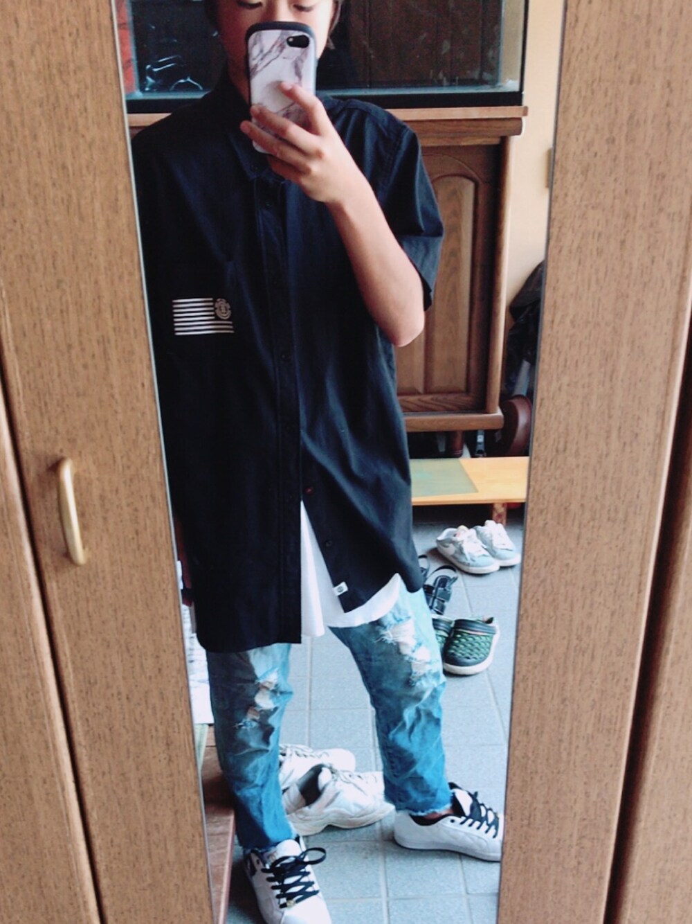 ホワイト系のスニーカーを着用したメンズの夏コーディネートの1枚目の写真