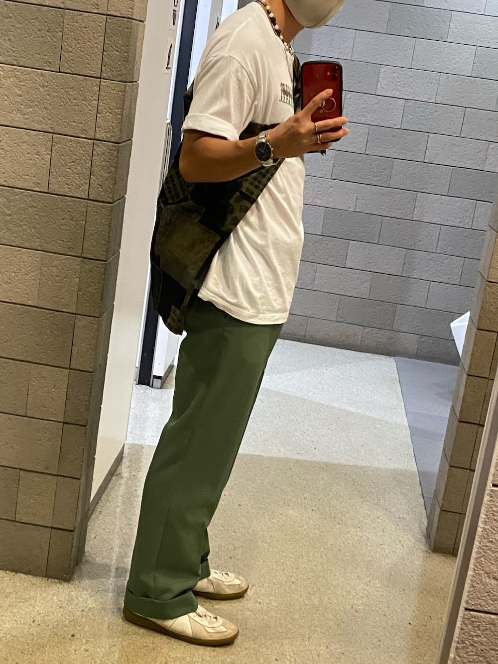 今年初のシャツ肩掛けはいい感じに収まりました。 グリーンのKAIKOのパンツがアクセントになってお気に入りです。