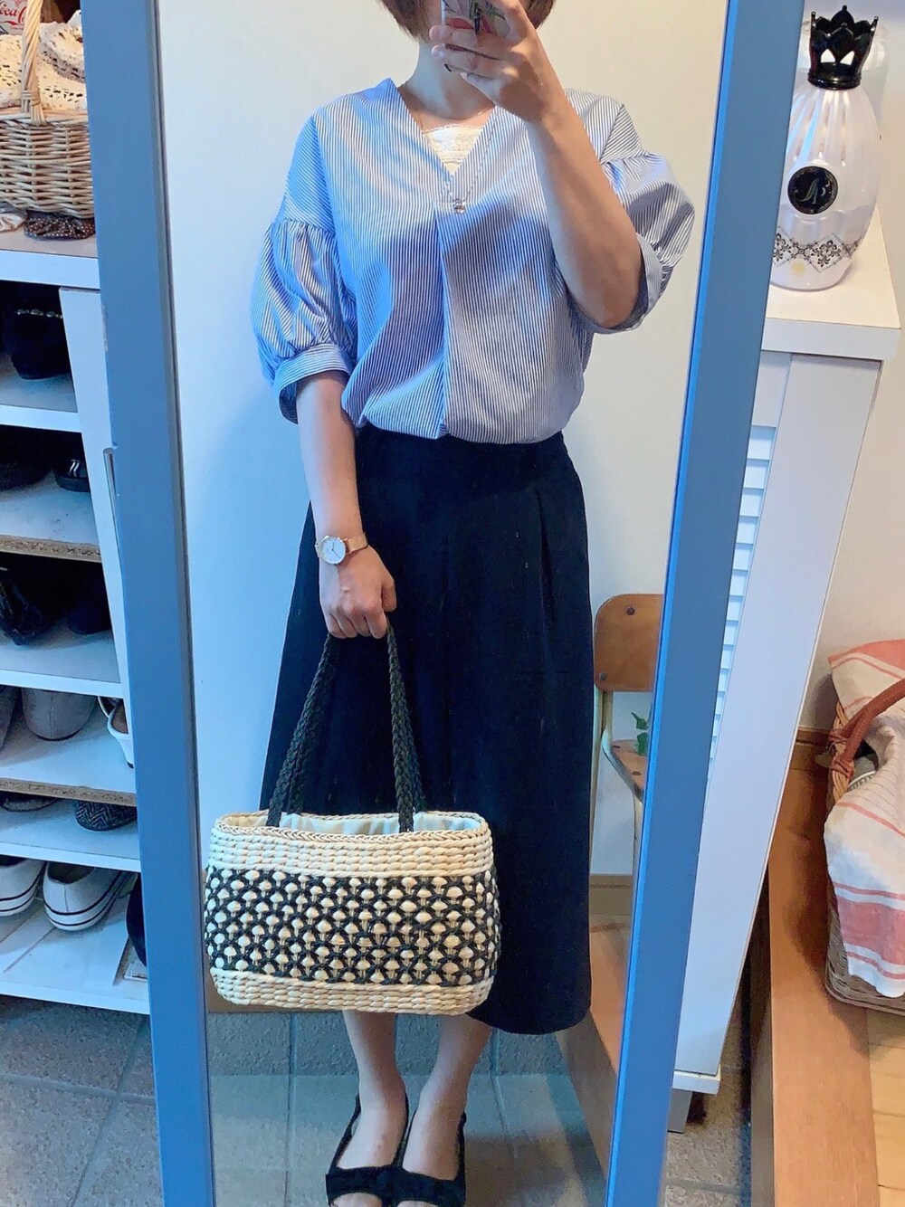 お仕事コーデです😊 *トップス しまむら 1,280円 *パンツ ユニクロ(ワゴン) 756円 *サンダル しまむら 900円 *バッグ 古着屋 864円 イヤリングはハンドメイドです☺️ (メルカリ等で販売してます)