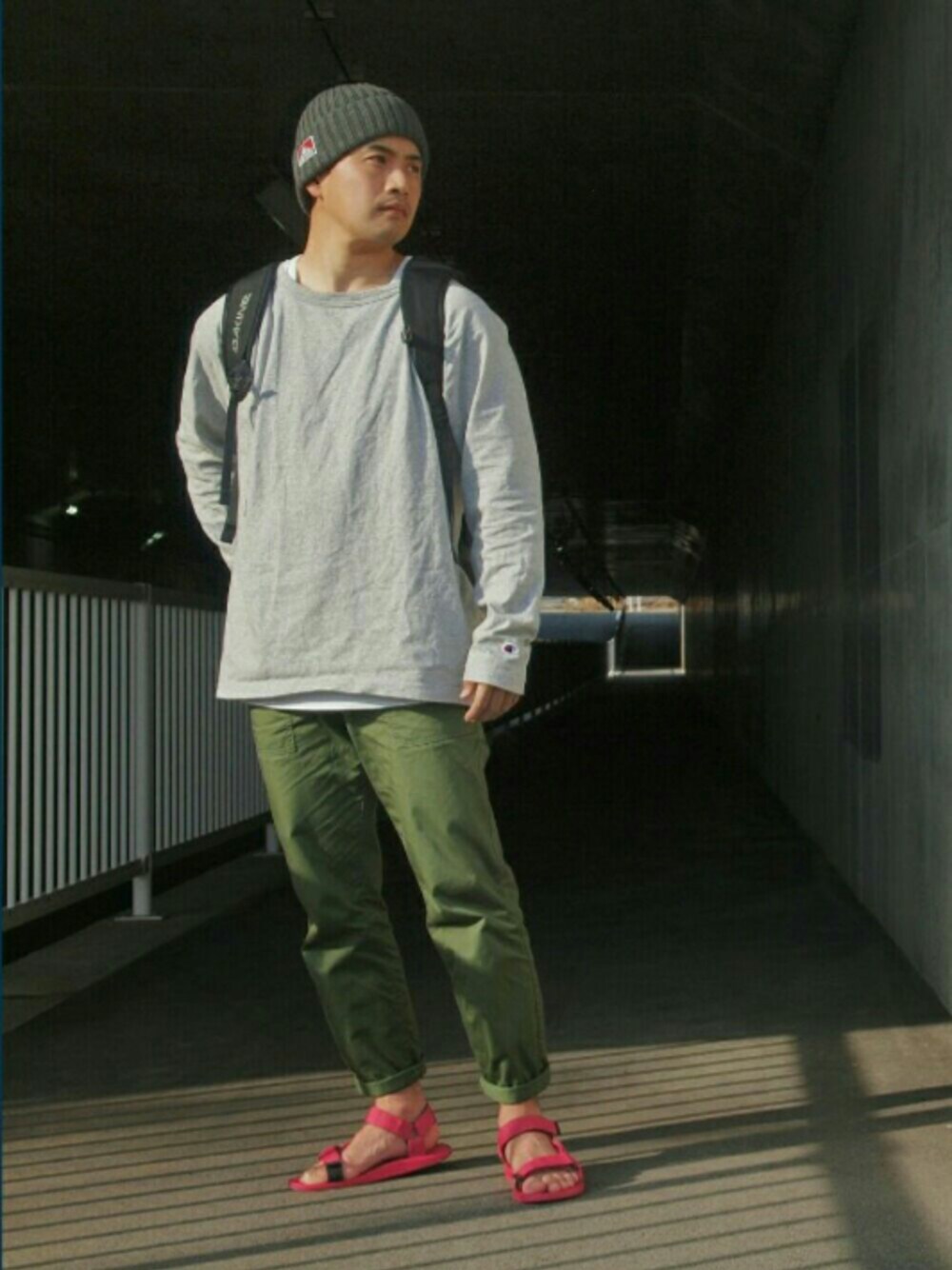 さあ春だ!! サンダル解禁♪ 個人的に冬でも裸足にサンダル生活はしていますが・・・ この季節、女性がカラーパンプスで春のコーディネートを楽しんでいるのを、 とってもお洒落で可愛いと思っています。 どうにか真似できないかな~というコーデをしてみました。 そんなわけで、春色なピンクのサンダルです。 T1011で質感の良いChampionのロンT。 袖がラグランなのと、襟ぐりがひろい(というかすぐに伸びてしまった)ところがお気に入りです。 インナーに着た白タンクトップの肩がチラリと見える、健全な色気を狙ってます。 この体格で全くそうは見えませんが、 頑張って中性的?にしたつもりなのでした。 真剣にチャレンジしてみたものの、 うん、ダメだった。 ご覧いただいて、ありがとうございました!