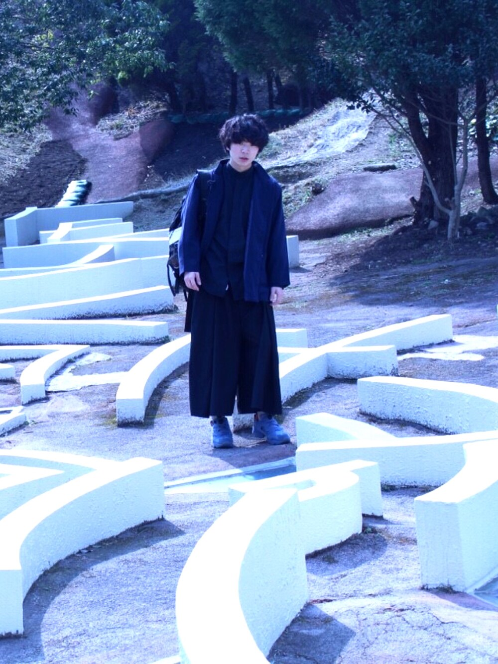 . 養老天命反転地にて。 下は黒の袴パンツ。 上はノーカラーのシャツに スタンドカラーのジャケットです。 養老天命反転地…凄く刺激的な場所でした。
