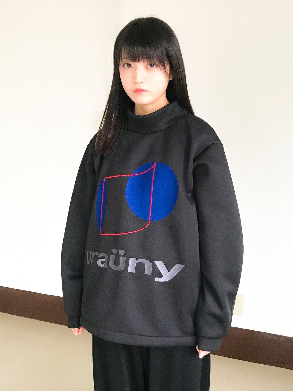 chloma uraüny ロゴ po 体を保護してくれるような心地の、ハイネックプルオーバー。 架空の人工知能 uraünyのロゴを前身頃に大きく刺繍で流しました。 元来資材用だった生地の糸使いを工夫して衣料用に開発されたダブルラッセル生地を使用。 独自のクッション性、ツヤ感があります。シワになりづらく、 へたりにくいため、長い間にわたって型崩れし辛いアイテムです。