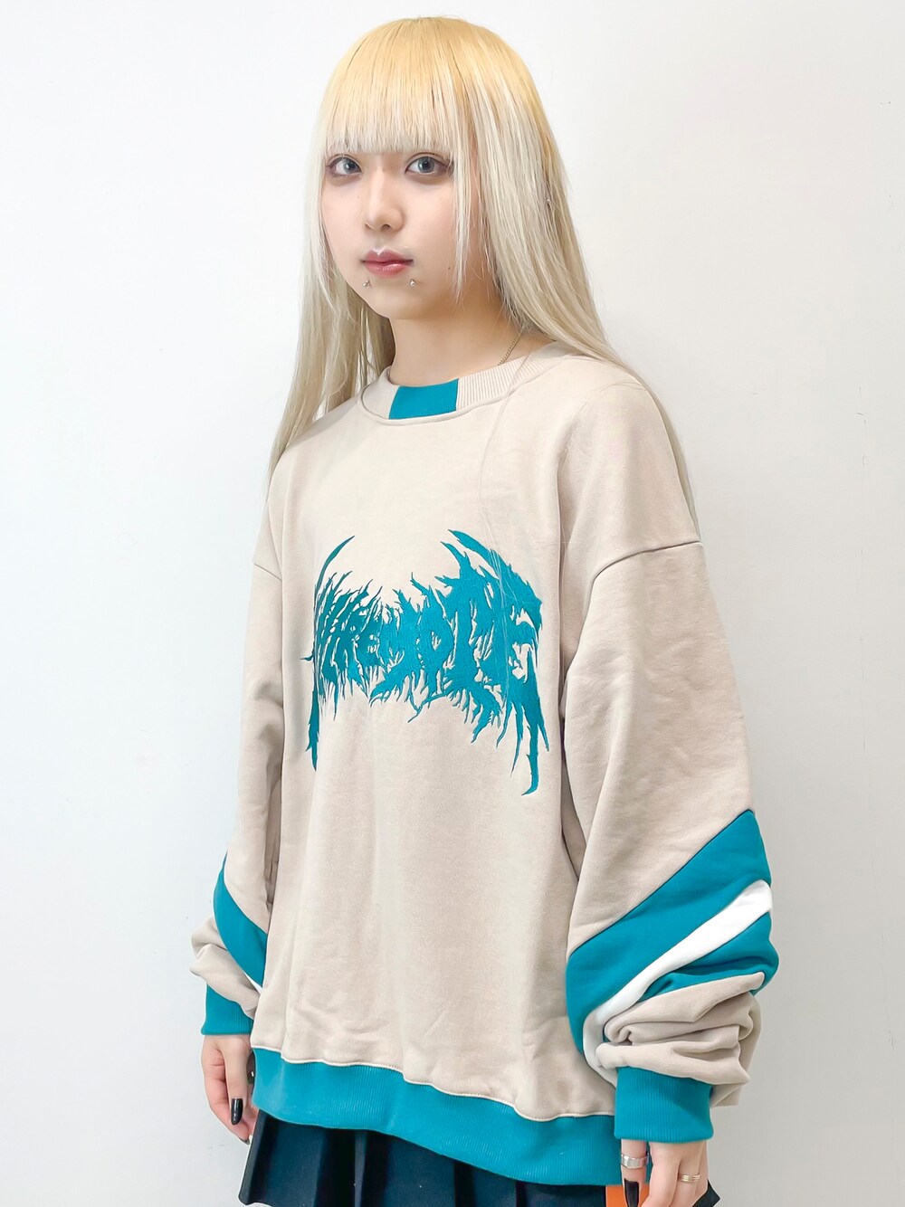 killremoteの新作アイテム 正面の刺繍と袖の切り替えが特徴的なベージュのスウェット