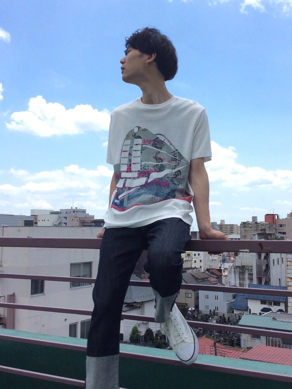 青空に映えるコーデ エレファブのスキニーは折り返したように見える所が特徴的なデザイン