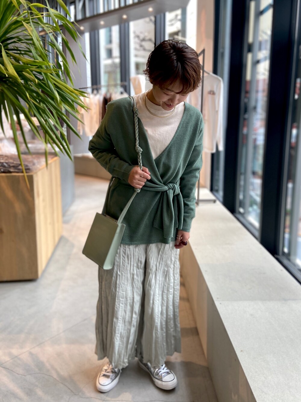 今季流行のミントグリーンをチェック✔︎✔︎✔︎ 素材の違いで動きのあるコーデに🍃 ワンアイテム持っているだけでトレンドをキャッチできますよ🤗