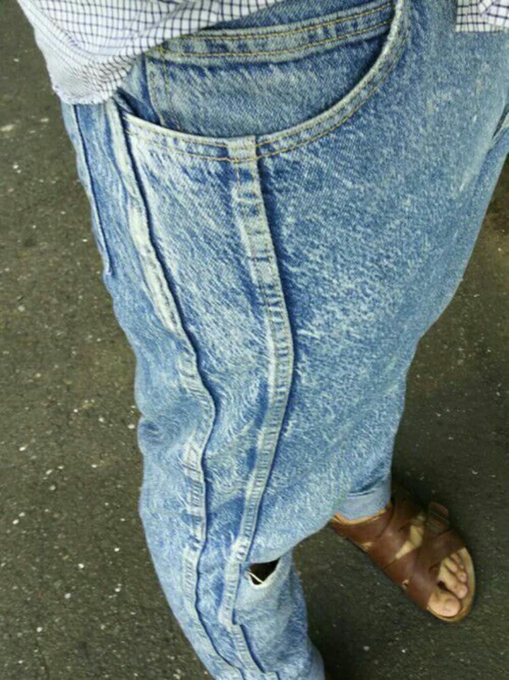 いつもの?ジーンズで近所へ。 10年目に突入、だいぶボロくなってダメージ全開です、夏仕様?です、ですが暑いです。 それでも、こういうデザインのやつ好きなんで履きます(笑)