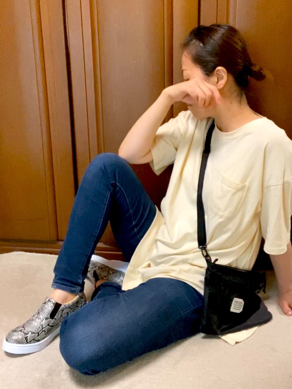 ゆるっとしたラクチンコーデを パイソン柄スリッポンで引き締めてみました。スリッポン、980えん。ラブ。