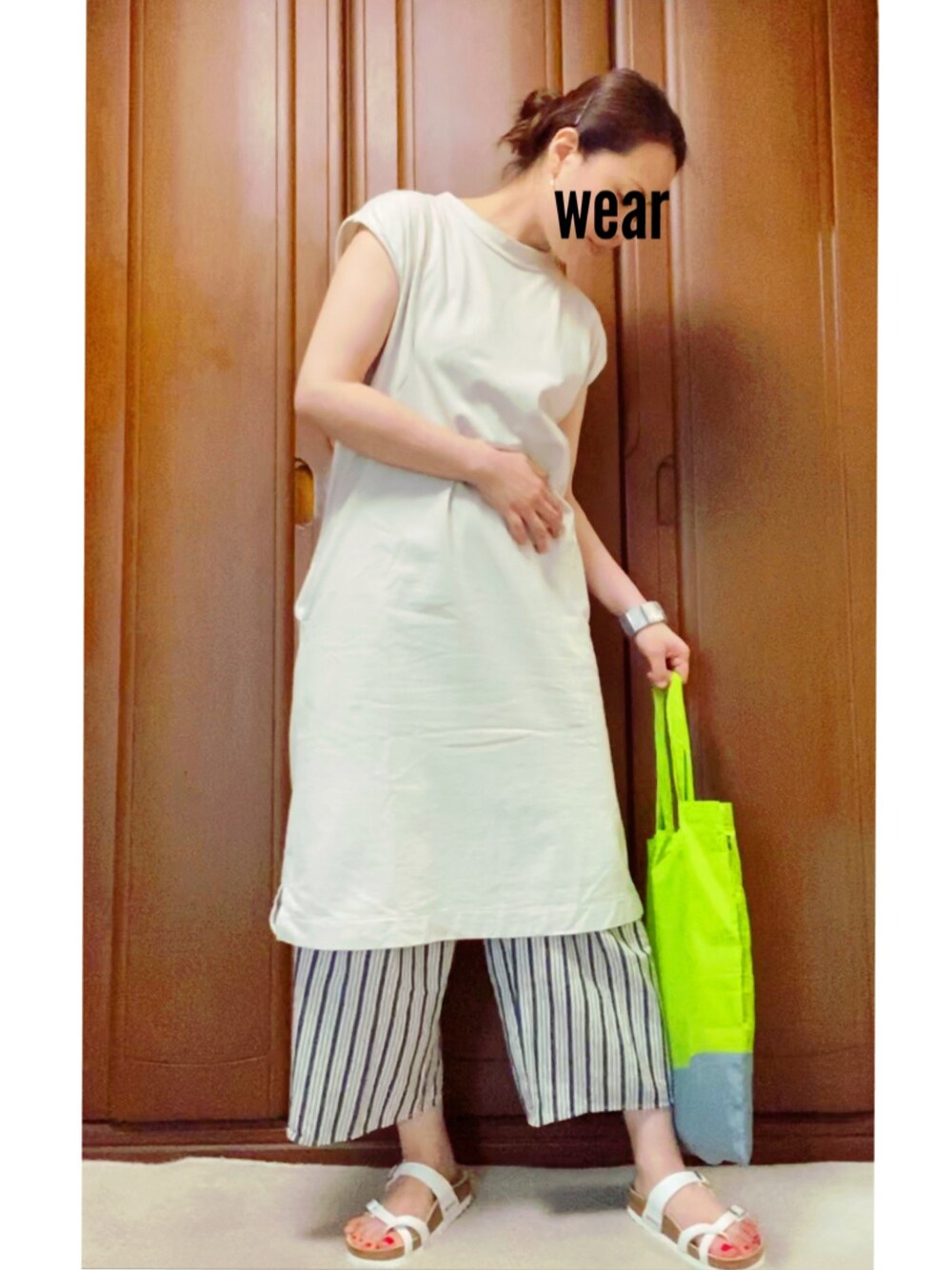 ご覧いただきありがとうございます😊 ネオンカラーのエコバッグでシンプルコーデに味付け。 エコバッグはずっと使っていなかったものを引っ張り出してきました〜