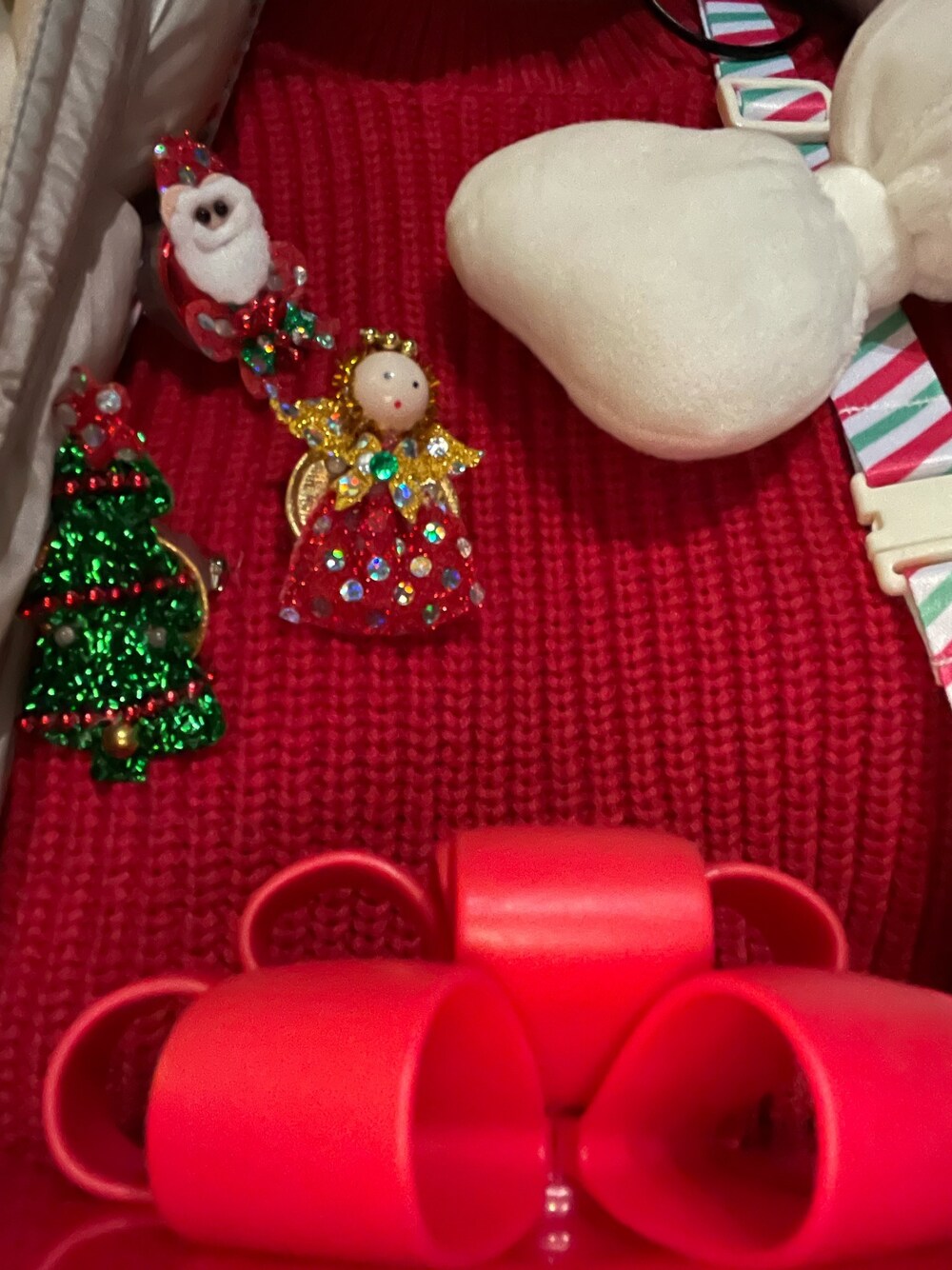 クリスマスディズニーに行った時 🎄🧣☃️🤍🦌 シンプルな赤いニットにかわいいクリスマスブローチをつけて行ったの~🎶 スイッチを押すと光るんだ~✨