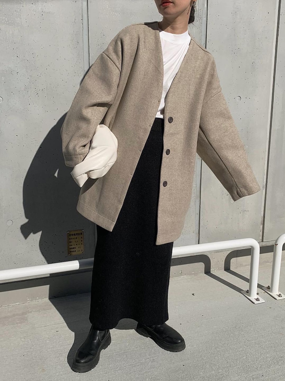 sonのノーカラーコート「ノーカラーカットメルトンミドルコート」を使ったコーディネート
