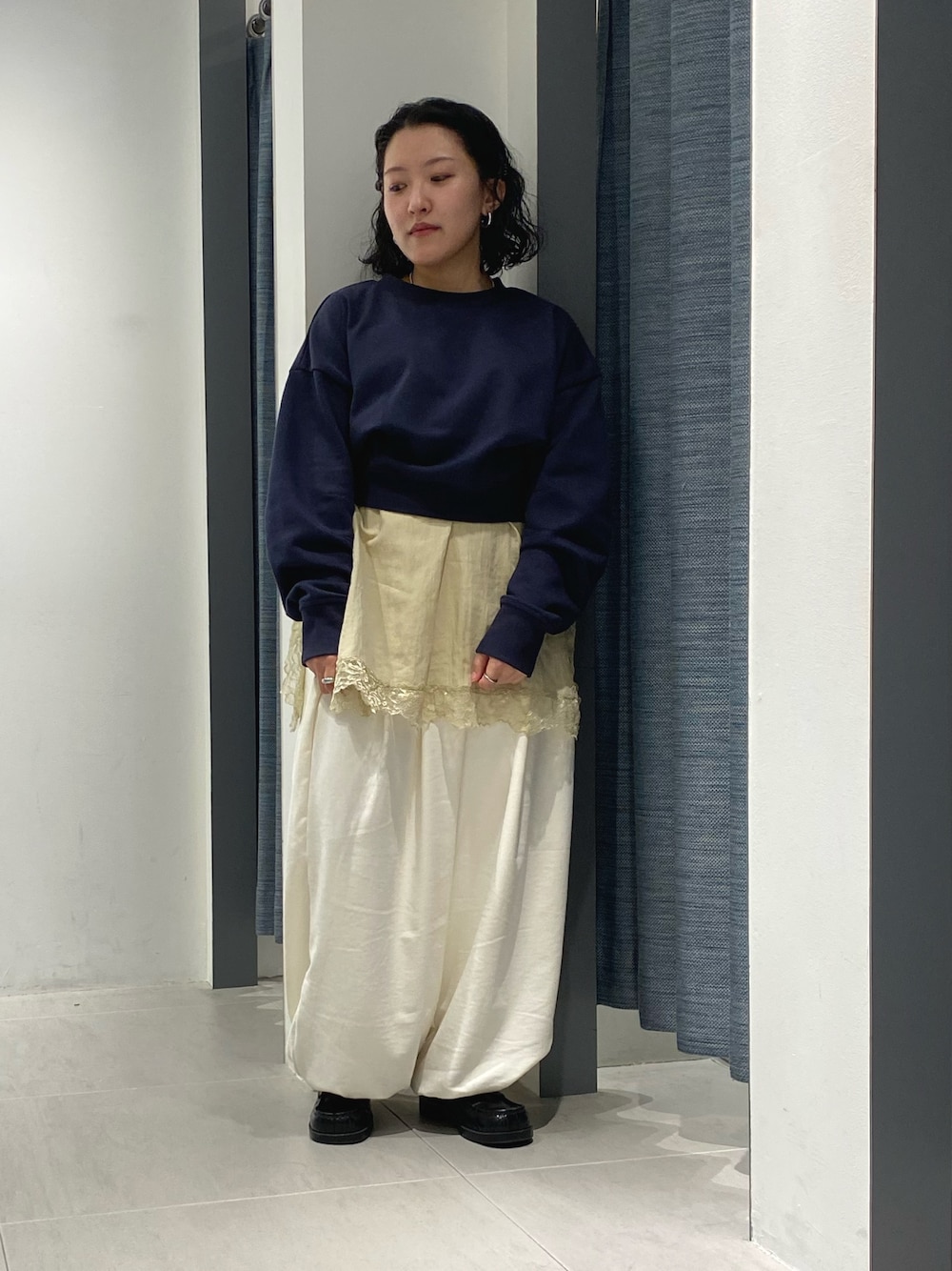 裾のパフっとしたシルエットがかわいいパンツをスウェットとレースで女性らしさが残るようにコーデを組んでみました🙂↕️🤍 スウェットは丈が短めなのでレイヤードや、ボリューム感あるパンツと相性🙆です!