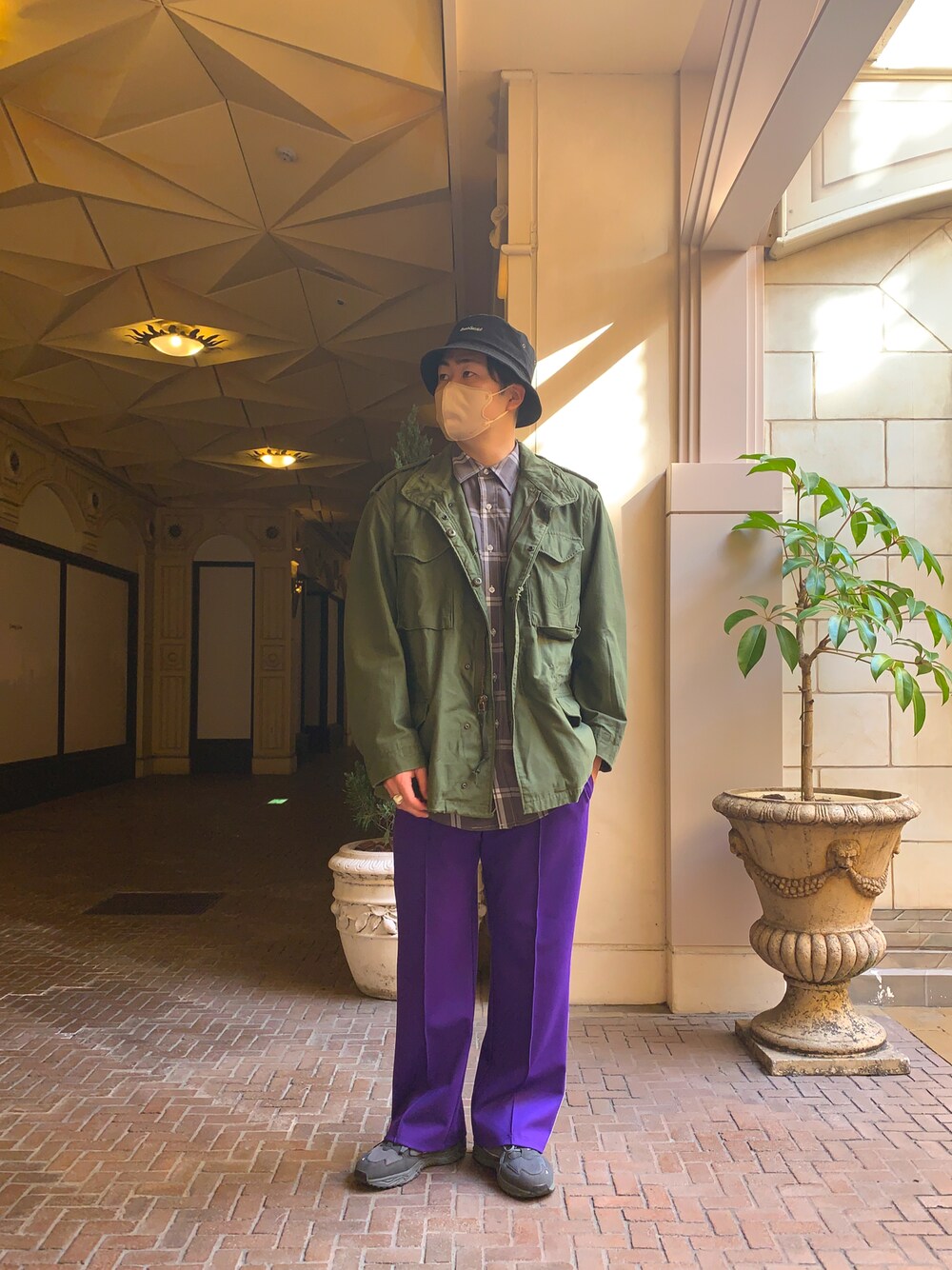 カジュアルミリタリー パープル×カーキの相性◎ 邪魔しないように中には抑えめのチャコールのチェックシャツを! このトラックパンツ本当に万能でオールシーズン使えそう✨
