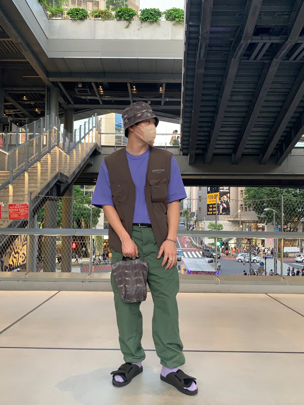 ミリストコーデ 宮下パークでパシャリ📸 バケハやパープルT、ベストでヤングな感じを出しつつ、全体的にくすんだ色を使うことで、大人のカジュアルスタイルになりました🕺🏻 カーゴパンツは90’s usedでスニーカー等と合わせるとかなり男臭いので足元は軽めにムーンスターサンダルにしました🩴 珍しく今回はカスタネ少なめ😂