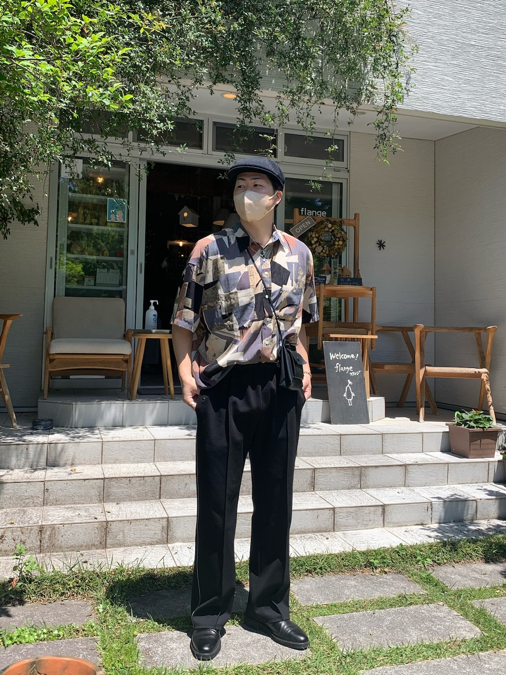 柄シャツoldスタイル🕰 栃木の雰囲気のある雑貨屋さんの前でパシャリ📸 柄シャツ以外を黒でまとめて、昔ながらの雰囲気に寄せてみました🍂スラックスだと面白みがないので、パンツは黒のトラックパンツにし、現代風にアレンジ⛏ 柄シャツはWHIMSIC の新作で、幾何学模様であるのに加えて、様々な色が入ったシャツになってるので、他のアイテムとの相性◎
