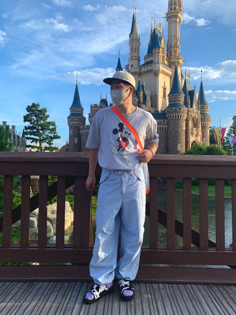 ポップなミッキーコーデ🐭 シンデレラ城を背にパシャリ📸🏰 優しいトーンの色使いで、ミッキーカラーのブルーをボトムスに入れました✨ Tシャツのミッキーのプリントのサイズが絶妙で、秋はカーディガンの中に仕込ませてもかわいいかなと💡 カーゴパンツの色味がこれまた珍しく紫みの淡いブルーなので、上下で寒色寄りの涼しげな色使いに🌊 キャップとシューズで締めることが多いんですが、今回は締めるというよりラフに馴染ませるイメージで、ベージュ×ネイビーのツートーンキャップと牛柄のシャカサンダルで抜け感と遊びを入れ、ネオンオレンジのトートでパンチを効かせながら全体を締めました⛓