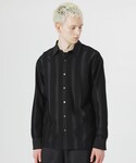 レノクロスレースシャツをメインにコーディネートしました。 ややゆとりのあるサイズのロングスリーブシャツです。 衿、前立て、カフスをサテンで切り替えることでレースの風合いが際立つデザインに仕上げています。 レースの透け感を活かしyoshiokuboのTシャツをアクセントにカーゴパンツで今年らしいコーデにしました。
