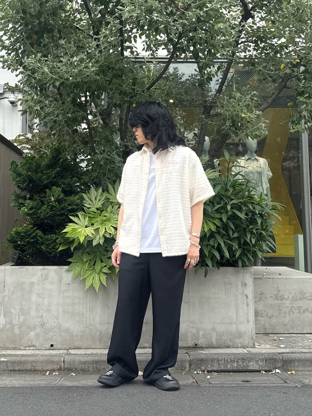 シアーシャギージオメトリックハーフスリーブシャツをメインにコーディネート。 インナーには別注のヨシオクボのTシャツを合わせて一癖あるコーデにしてみました。 程よくリラックスしたシルエットで暑い日でも着心地抜群です。