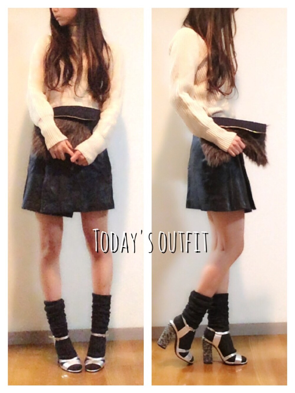 ミニスカートはあんまりはかないけど、たまには♪♪ ショート丈のタートルニットと合わせてみました☻ もこもこのソックスにサンダル合わせがすきです♡ Bag : So