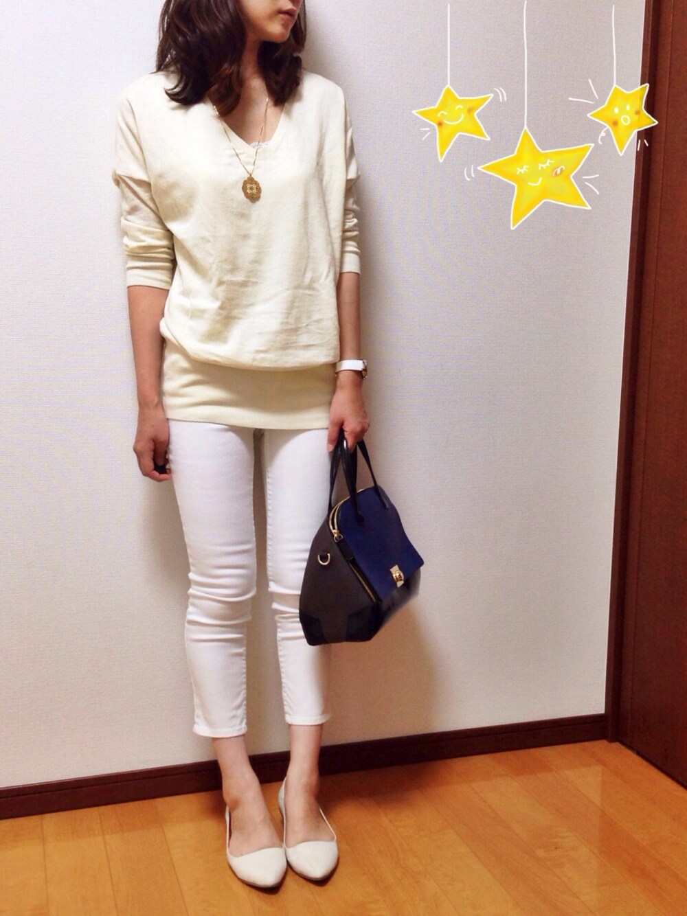 背が低いとオールホワイトは 難しい… ので♩ トップスは、アイボリーで 色のニュアンスに違いを つけてみました\(^o^)/ でも、短足は隠せない( ˙൧̑ ˙ )