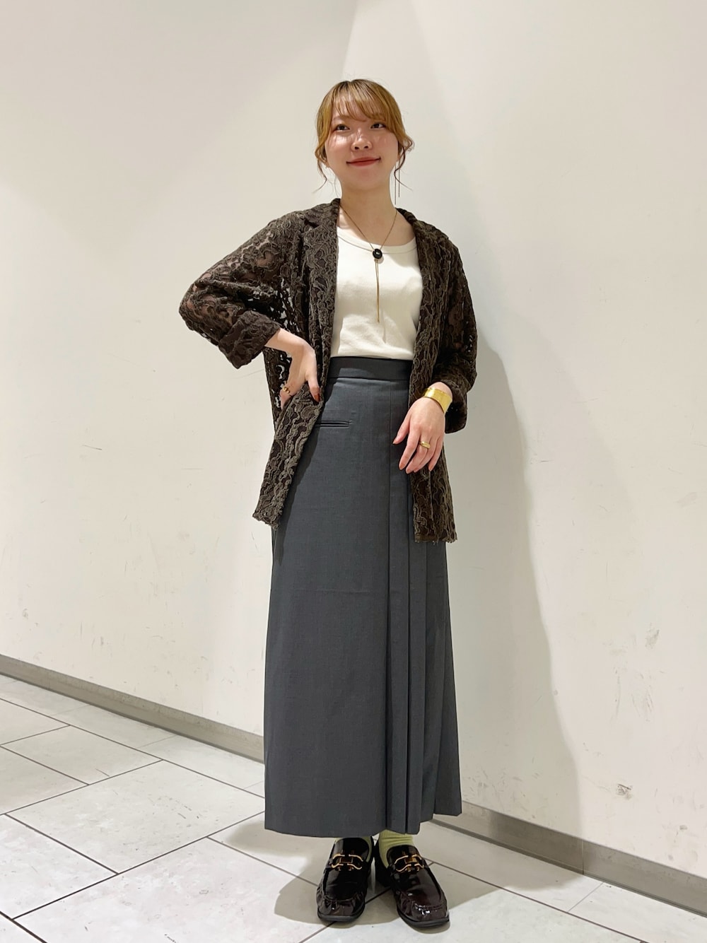 モールレースで高見えするジャケットです✨️ 入荷を楽しみしてた商品でこのカラーをリアルバイしました🤎 レース素材でもチクチクしないので、肌が弱い方でも着用いただけます! 今の時期だとタンクトップやキャミソールと合わせるのがおすすめです♪ 肌寒い秋にも大活躍間違いなしのジャケットです✨️ スカートは程よいプリーツでデザイン性あります❕ シルエットもボディラインをひろわずスッキリ見えるのでおすすめです♪ 是非店頭でもお試しください✨