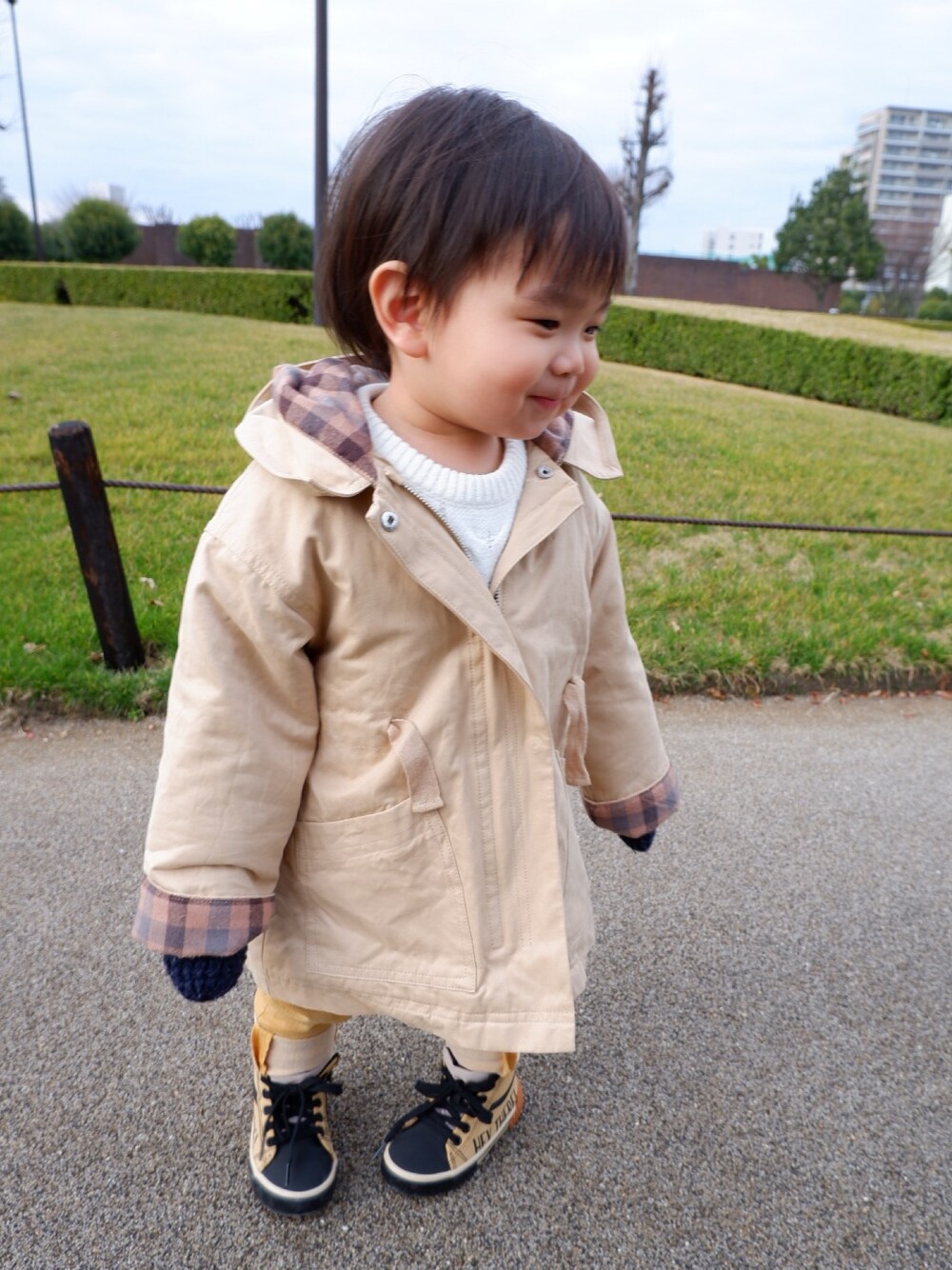 よく行く公園でお散歩🚶♂️だいぶ歩くの慣れてきたみたいなのでニューシューズ👟トレンチはサイズ大きいのでまだ着られてる感が😳💦 ♡♡ギンガムフェス告知♡♡ ギンガム大好きなので楽しみにしてます☺️💕