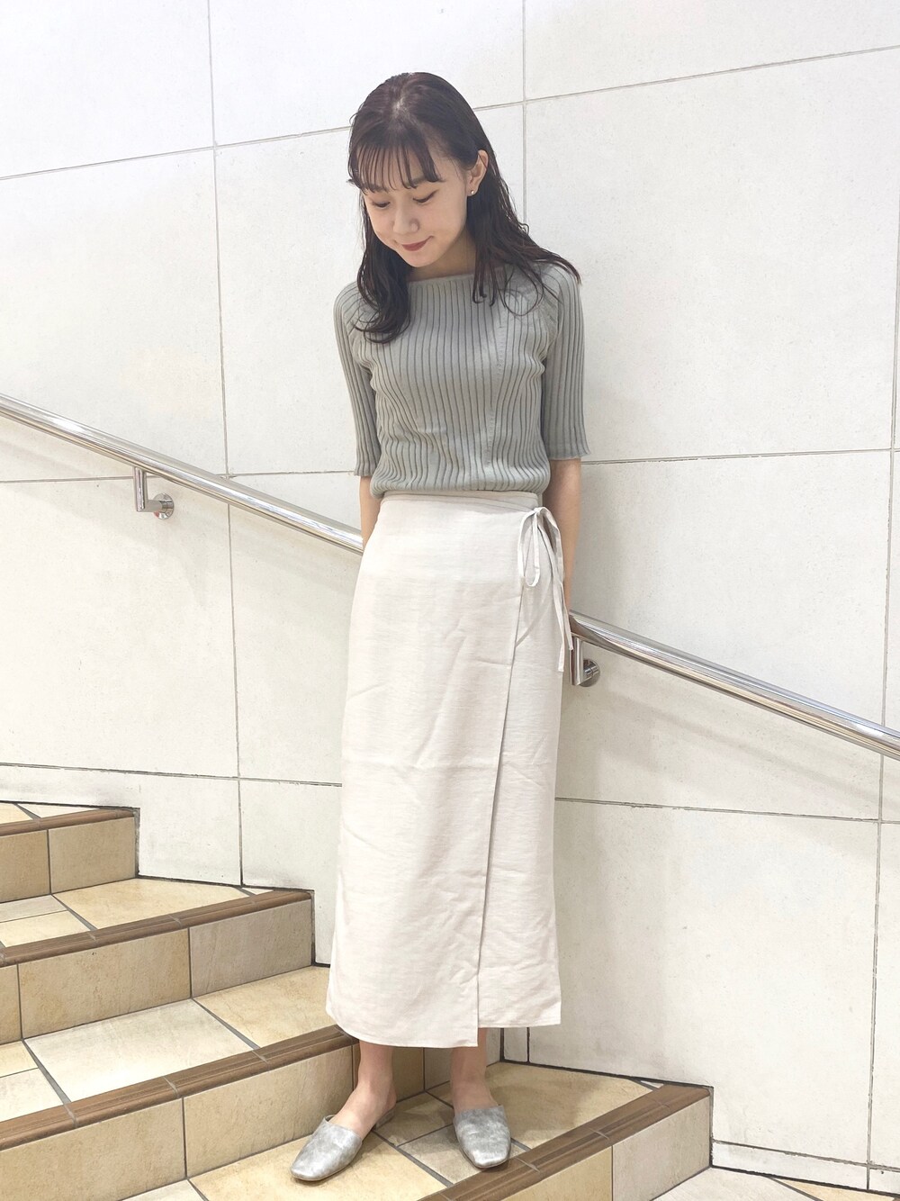 スクエアネックセーターは首元がスッキリ見えて、 少しタイトなサイズ感なので 女性らしいシルエットで着用頂けます♩ きれいめコーデにもピッタリのアイテムです☺︎ リネンライクラップスカートは、 シンプルですがラップ風デザインが トレンド感をさりげなく出してくれます◎