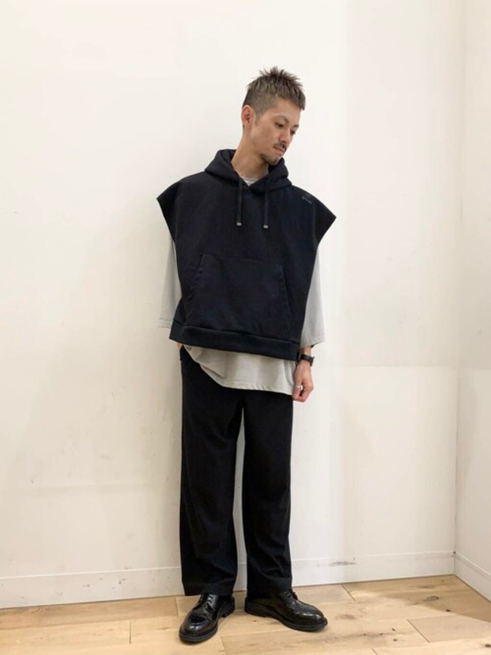 SENSE OF PLACE ONLINE STOREのパーカー「Uiscel フィルム裏毛フードベストプルオーバー」を使ったコーディネート