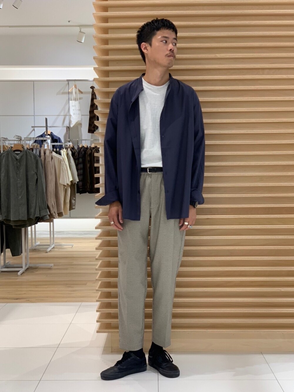 トレンドのくすみカラーのシャツを使用したコーディネート。 柔らかな生地感のこちらのシャツは、肌触りの良さが特徴。 色味も綺麗なので、Tシャツの上でも、もっと冷えてきたらインナーとしてもご利用頂けます◎ パンツはガングラブチェックパンツ。 レトロな配色が特徴で、タックが綺麗に入っていて形がとても綺麗です。 ネイビー×ベージュでクリーンな大人カジュアルコーデに仕上げてみました! 皆様もぜひ!! よろしくどうぞ!!
