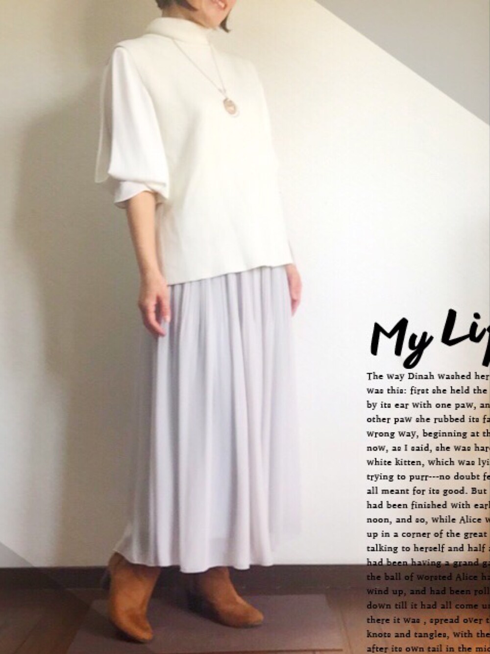 ホワイトコーデ タートルネックのニットは後ろが開いてるので、同色のブラウス合わせました☺️ 後ろ姿は小窓にあります〜 いつもいいね👍お気に入り☺️フォローありがとうございます💕💕とってもとっても嬉しいです😊