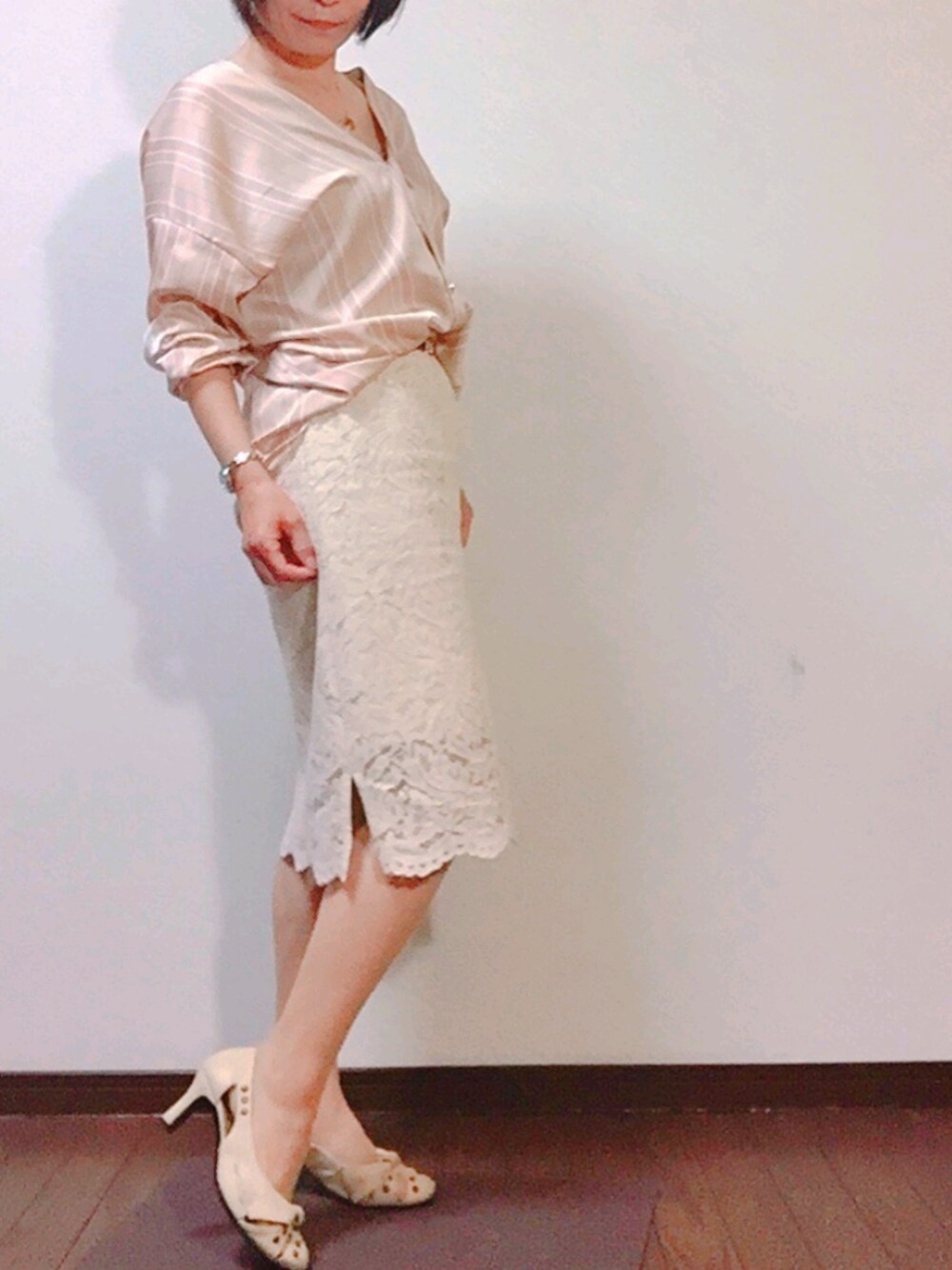 光沢のあるビンクのストライプのブラウスと白のレースのスカート