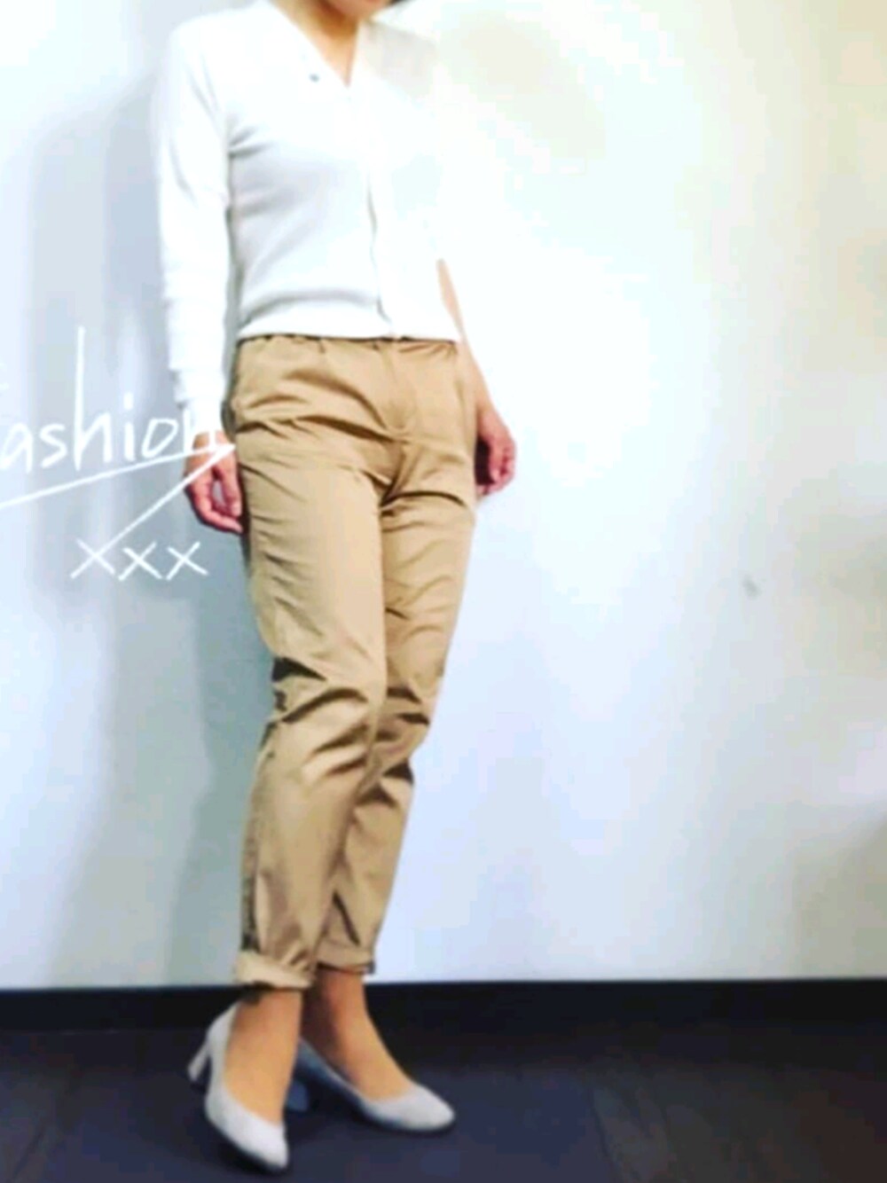 ホワイトのカーディガンの前を止めて、ベージュのパンツと