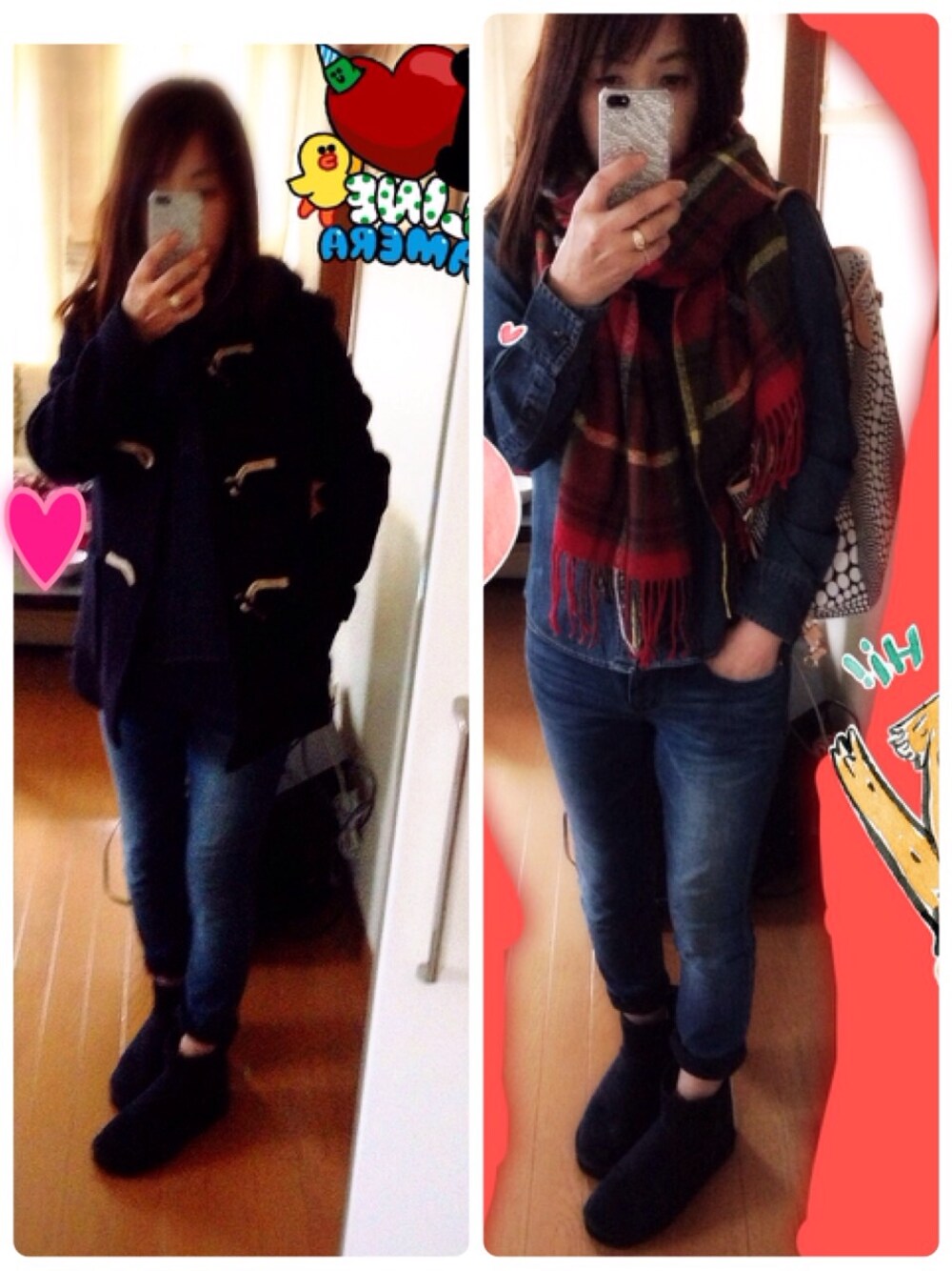 デニムシャツ UNIQLO デニムパンツ GU ブーツ GU マフラー ジャニスマーケット ダッフルコート UNIQLO デニムオンデニムオンダッフル 外は寒い (・_・;