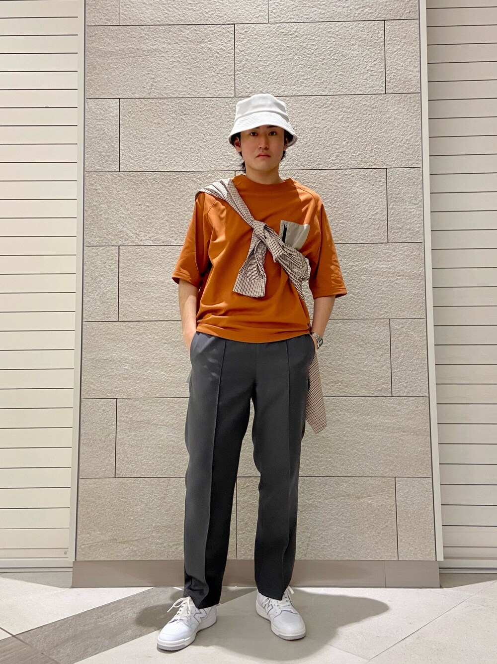 こんにちは! オレンジのTシャツをベースに ハットとシューズ Tシャツとシャツで色合いを統一してみました! 是非ご参考にしてみてください!